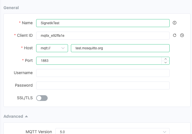 | Client ID | Any unique string, e.g. mqttx-dev-01 |